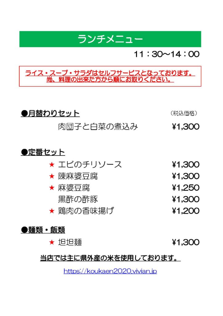 月替わりセット 肉団子と白菜の煮込み_¥1,300 定番セット 陳麻婆豆腐_¥1,300 鶏肉の香味揚げ_¥1,200 黒酢の酢豚_¥1,300 麻婆豆腐_¥1250 エビのチリソース_¥1,300 麺類・飯類 担担麺_¥1,300 FacebookXBlueskyHatenaCopy